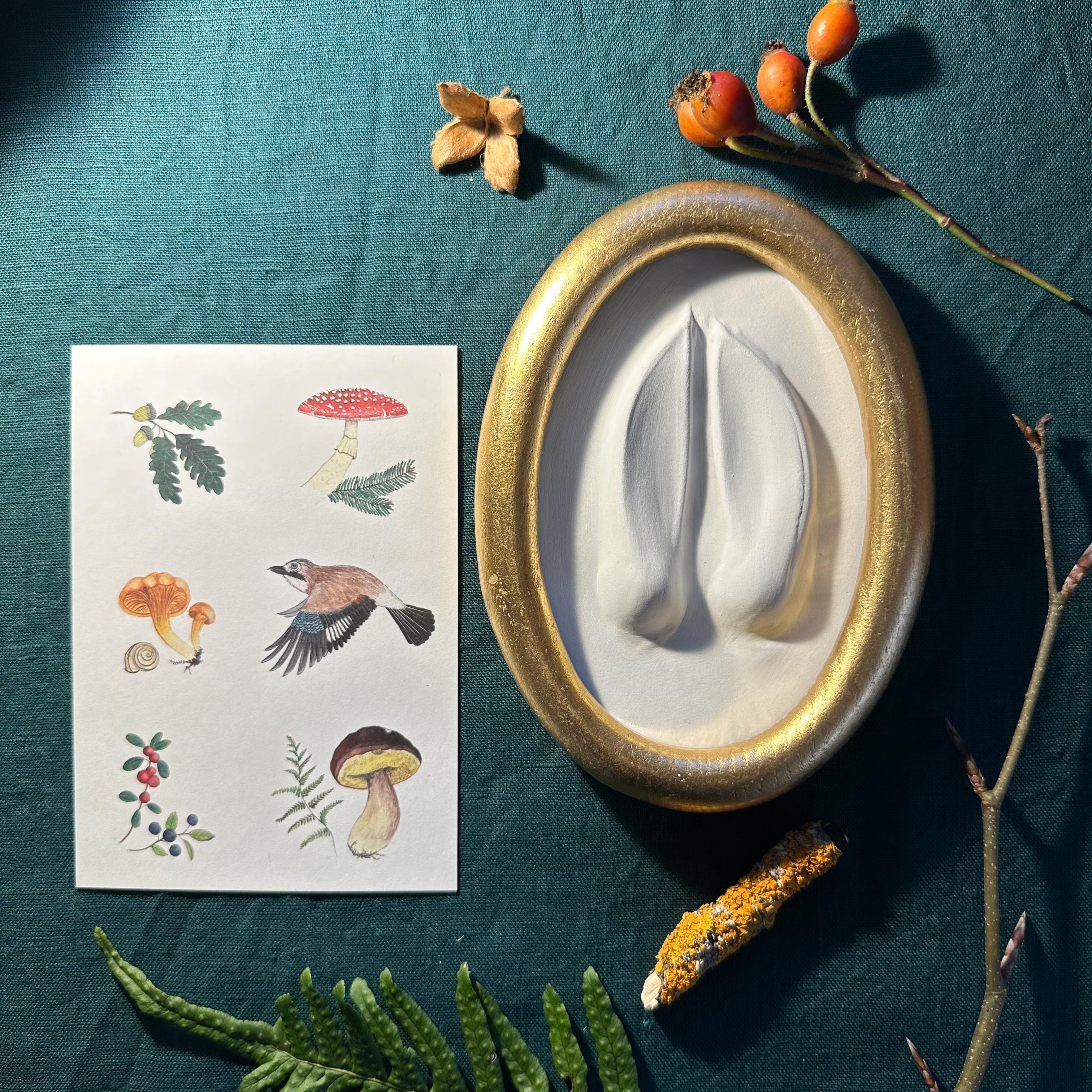 Original Abguss einer heimischen Hirschspur (Trittsiegel) aus dem urigen Waldviertel. Wir suchen und gießen unsere Fährten selbst (im Zuge unendlich vieler Stunden zu Fuß im Wald). Im Atelier werden die Trittsiegel dann nochmals mit feinstem Alabastergips gegossen, gerahmt und signiert. Jeder Abguss ist ein Unikat – Zeuge einer originalen Fährte, mit seiner eigenen Geschichte und seinem verborgenen Leben in unseren heimischen Wäldern. Größe und Form des Abdrucks wurden nicht verändert. Eine einzigartige  Wanddekoration, die es so nur einmal gibt.
