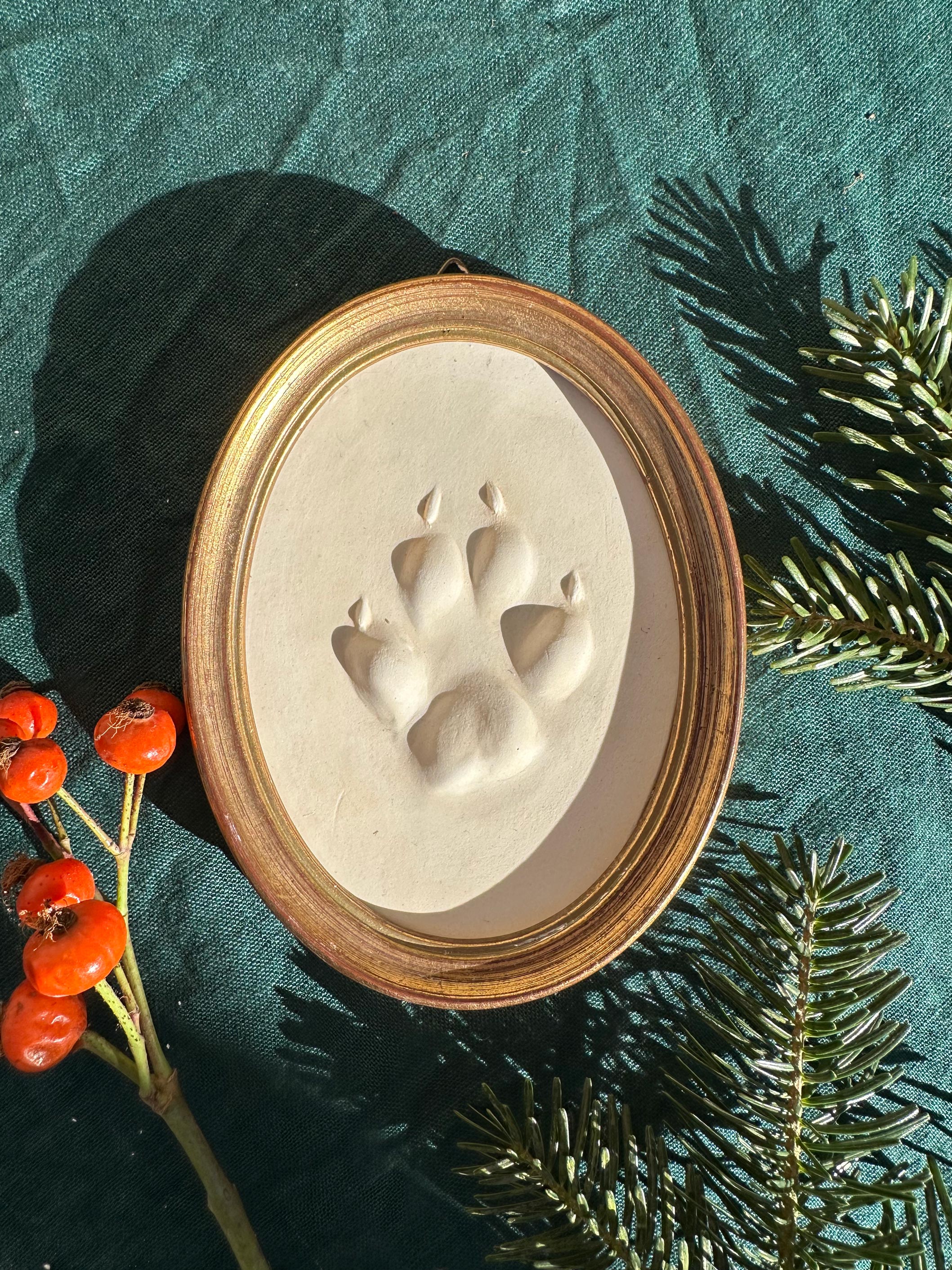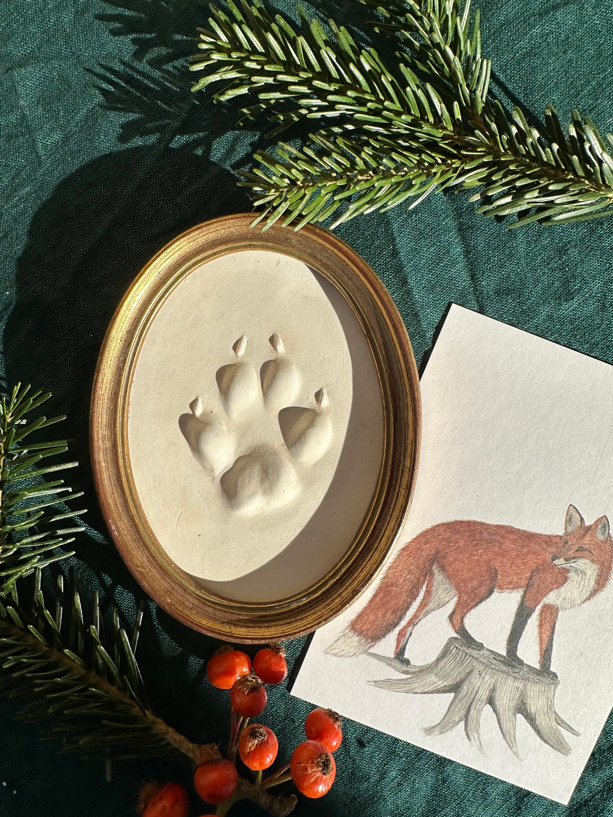 Original Abguss einer heimischen Fuchsspur (Trittsiegel) aus dem urigen Waldviertel. Wir suchen und gießen unsere Fährten selbst (im Zuge unendlich vieler Stunden zu Fuß im Wald). Im Atelier werden die Trittsiegel dann nochmals mit feinstem Alabastergips gegossen, gerahmt und signiert. Jeder Abguss ist ein Unikat – Zeuge einer originalen Fährte, mit seiner eigenen Geschichte und seinem verborgenen Leben in unseren heimischen Wäldern. Größe und Form des Abdrucks wurden nicht verändert. Eine einzigartige Wanddekoration, die es so nur einmal gibt.